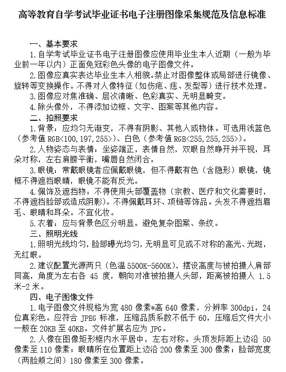 发表时间:2025-11-11 11:17来源:合肥招生考试网 根据《高等教育自学考试考籍管理工作规定》和安徽省教育招生考试院要求,现将我市2025年下半年自学考试毕业办理事项通知如下,请在我市参加自学考试且符合毕业条件的考生仔细阅读,并按要求提交毕业申请。 一、办理条件 考完专业考试计划规定的全部课程(含实践课、毕业论文)并取得合格成绩的考生可以申请自学考试毕业,申请自学考试本科毕业的考生须具有教育部承认的专科(或以上)学历作为前置学历,前置学历的毕业时间须在2025年12月30日(含)前。外省转入考生应在我省取得专科不少于5门、本科不少于4门笔试合格成绩方可在我省申请毕业。 在我市申请毕业的考生需持有我市自学考试准考证且在我市取得不少于1门合格成绩。 二、办理形式 毕业申请通过合肥市教育考试信息服务系统办理。 电脑端:在浏览器地址栏输入https://fw.hfzk.net.cn/pc,进入合肥市教育考试信息服务系统的“自学考试业务办理”栏目,点击“毕业申请”进行办理。 手机端:登录个人皖事通APP,地区选择“合肥市”,搜索“教育考试信息服务系统”,进入合肥市教育考试信息服务系统的“自学考试业务办理”栏目,点击“毕业申请”进行办理。 三、办理时间和流程 (一)提前准备: 1.证件照。考生在申请毕业时须提交一年以内正面免冠彩色头像的证件照(证件照要求见文末),证件照用于考生的毕业证书、毕业生登记表(学历档案)以及学信网的电子注册,请考生认真对待,不得上传生活照、手机自拍照,不得对照片进行美化美颜。 2.学历证明材料(前置学历核验)。申请自学考试本科毕业的考生须具有教育部承认的专科(或以上)学历作为前置学历。考生须下载安装学信网APP,通过学信网APP查询自己的学历信息。如查询不到自己的学历信息,考生在毕业申请时须到现场提供如下学历证明材料。 如考生所持学历证书属于2001年及以前的高等教育学历证书,考生须通过中国高等教育学生信息网(学信网,网址:https://www.chsi.com.cn/xlrz/index.jsp)完成学历认证,现场确认时提供《中国高等教育学历认证报告》; 如考生所持学历证书属于2002年及以后的高等教育学历证书,考生须通过中国高等教育学生信息网(学信网,网址:https://www.chsi.com.cn/xlrz/index.jsp)完成学历认证,现场确认时提供《教育部学历证书电子注册备案表》。 如考生所持学历证书属于国(境)外学历学位证书,考生须通过中国留学网(网址:https://www.cscse.edu.cn)完成学历认证,现场确认时提供教育部留学服务中心出具的《国(境)外学历学位认证书》原件及复印件。 如考生能够在当年12月30日前(毕业证书上注明的落款日期)取得专科或专科以上学历的省内应届高校毕业生需要办理自考本科毕业申请,需由考生就读高校于11月24日前向合肥市教育考试院申请统一办理相关手续,具体情况请考生咨询学校学籍管理等相关部门。但考生仍须在当年12月30日前按上述要求完成前置学历有效授权核验;未按时完成有效授权核验的视为放弃当次毕业申请,后果由考生自行承担。 3.2015年12月31日之前从外省转入但没有办理转入确认导致无法在安徽省自学考试考生服务平台上查询到转入成绩的考生须于11月25-27日(上午8:30-11:30,下午14:00-17:00),携带以下材料到合肥市教育考试院社会考试科办理转入现场确认,提供的材料包括(1)考生登录安徽省教育招生考试院网站(https://www.ahzsks.cn)“自学考试>业务办理”栏目“安徽自考2015年以前外省转入成绩查询”,查询到的外省转入成绩页面截图;(2)转出省的成绩合格证或成绩证明原件及复印件;(3)身份证原件及复印件。 4.考生若在安徽省自学考试服务平台上无法查询到实践课、毕业论文成绩的考生,须自行联系主考学校将成绩录入平台。 (二)操作流程 **步:前置学历核验(申请本科毕业的考生须完成前置学历核验,申请专科毕业的考生跳过此步骤) 申请自学考试本科毕业的考生请于11月20日-27日登录安徽省自学考试考生服务平台(网址:http:// zk.ahzsks.cn),进入“前置学历核验”,使用学信网APP扫码授权安徽省教育招生考试院通过学信网查询其学历信息,审核前置学历的真实性和有效性。 前置学历符合要求但核验不通过(在学信网上查不到学历信息)的考生需于11月25日-11月27日携带相关资料到市教育考试院进行现场审核确认无误后,方能进行下一步提交毕业申请。 第二步:提交毕业申请 时间:11月25日9:00-11月27日17:00 考生登录合肥市教育考试信息服务系统提交本次毕业专业,核对个人申请信息,上传证件照。 如有课程免考,须上传相关免考材料。如有课程学分替代,须勾选要替代的课程并录入其他专业的用于替代的课程。护理学专业的考生须上传实习手册。 如考生毕业需要使用2004年以前的成绩,请先在合肥市教育考试信息服务系统的“信息查询”模块的“考试信息查询”里选“自学考试2004年以前成绩查询”输入姓名和老准考证号查询2004年以前的成绩,查询到后再提交毕业申请,如有疑问,考生可电话联系市教育考试院,确认是否需要到现场解决。 第三步:考生信息和课程审核 考生首次提交毕业申请时间11月25日9:00--11月27日17:00,补充材料上传截止时间为11月28日11:30。 合肥市教育考试院审核考生上传的证件照是否符合要求;免考和课程学分替代是否符合规定;是否通过考试计划规定的全部课程;申